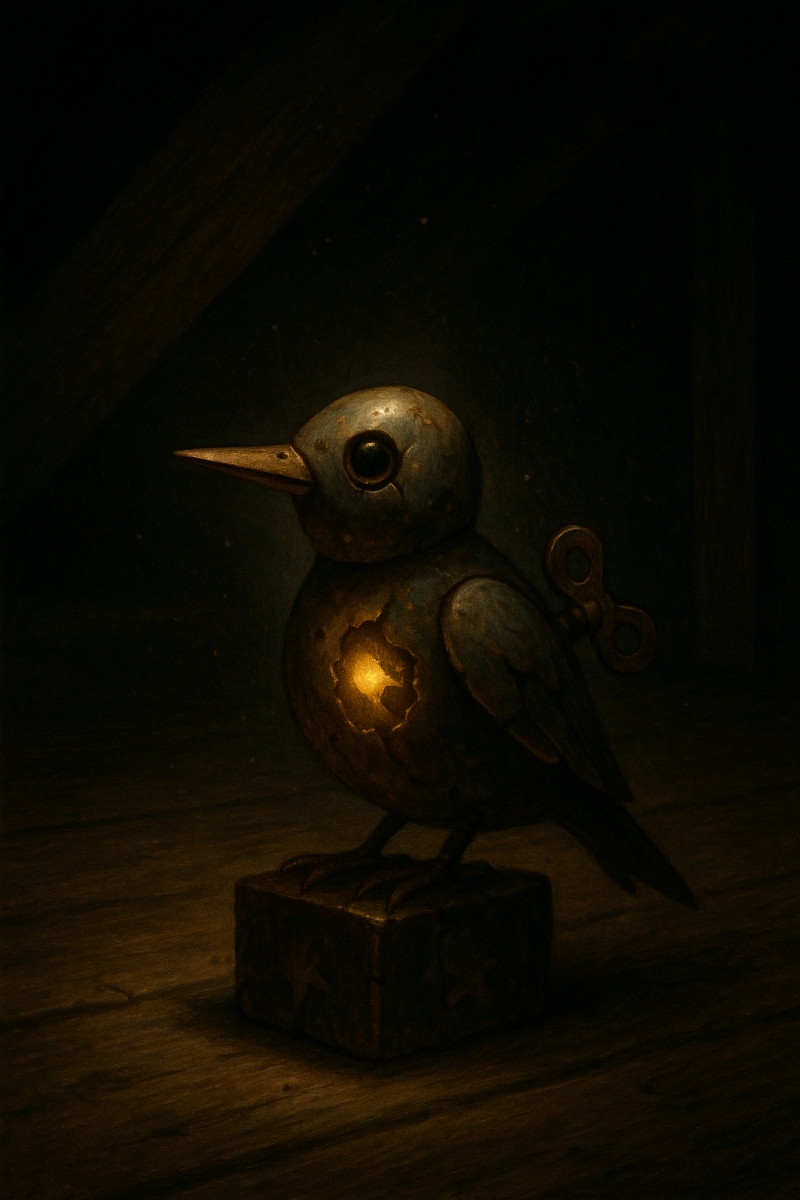 Echo is a fragile wind-up bird with tin wings and a key that no longer turns smoothly. Once it trilled cheerful songs, filling rooms with delight, but now every chirp is jagged, a mechanical rasp that echoes hollowly in the attic. Its feathers are painted tin, chipped and dulled with rust. When it stirs, the sound it makes is not song, but the grinding of memory against silence. Echo still tries to fly, though its wings no longer remember how.