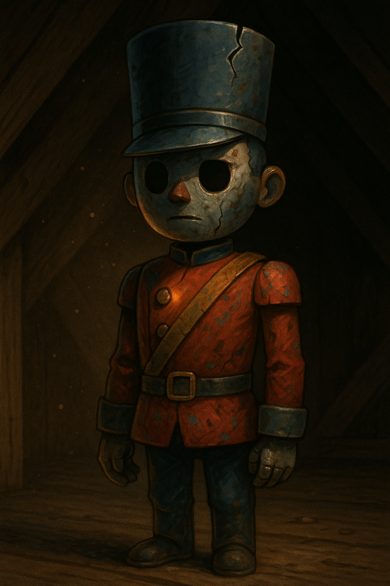 Once the proud guardian of the playroom, Rusty’s tin joints squeak with every step. His paint has dulled to a weary patina, and one eye is chipped beyond recognition. Yet he clutches his dented rifle with solemn resolve. Rusty remembers order, the rhythm of drums, and the command to guard, but the playroom he swore to protect no longer exists.